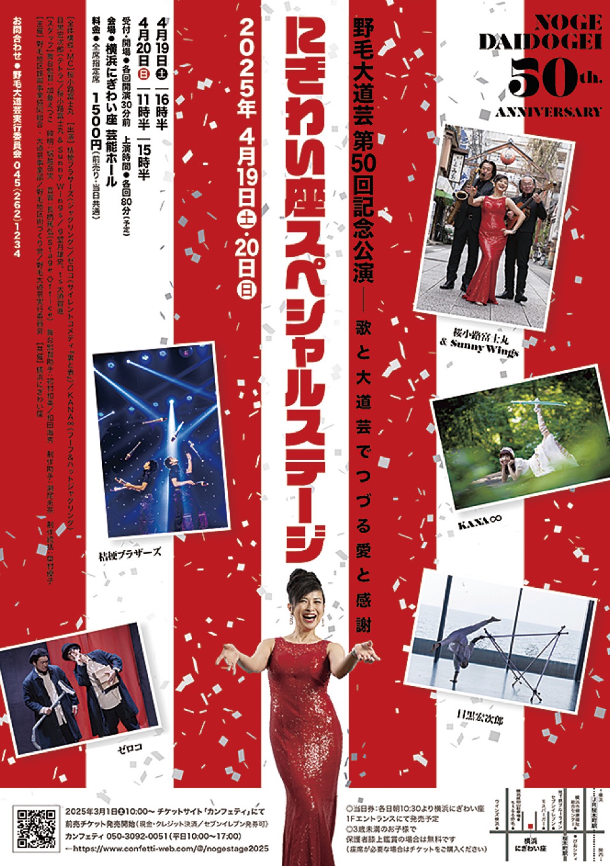 これを記念して、コロナ禍で開催された「野毛大道芸スペシャルステージ」が復活。横浜にぎわい座を会場に、屋内ステージの良さと野毛大道芸らしさが合わさった華やかで熱いステージが繰り広げられる。歌とMCの桜小路富士丸&SunnyWingsほか、多彩な4組のパフォーマーが登場する。野毛大道芸の詳細はHPで。