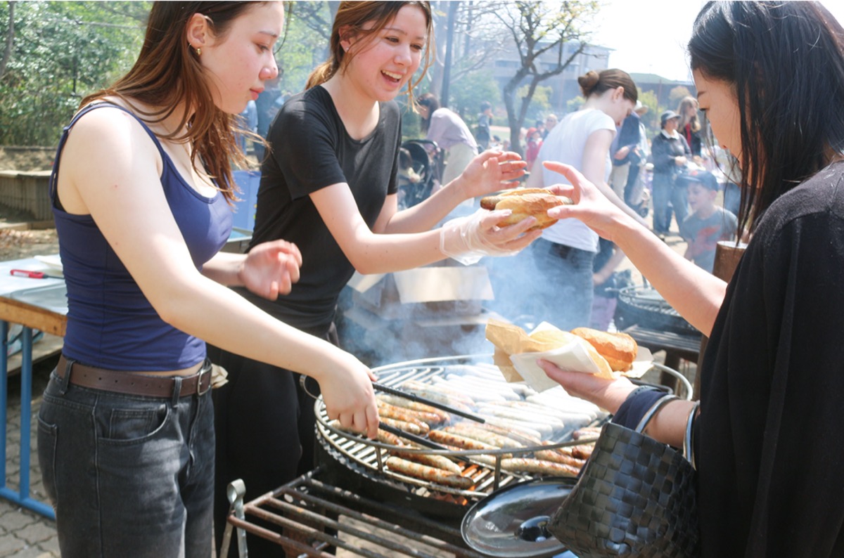 今年は例年人気のケーキの販売はなかったが、中庭や校舎の前で販売されたソーセージやプレッツェルなどのドイツ料理の模擬店には、長蛇の列が出来ていた。