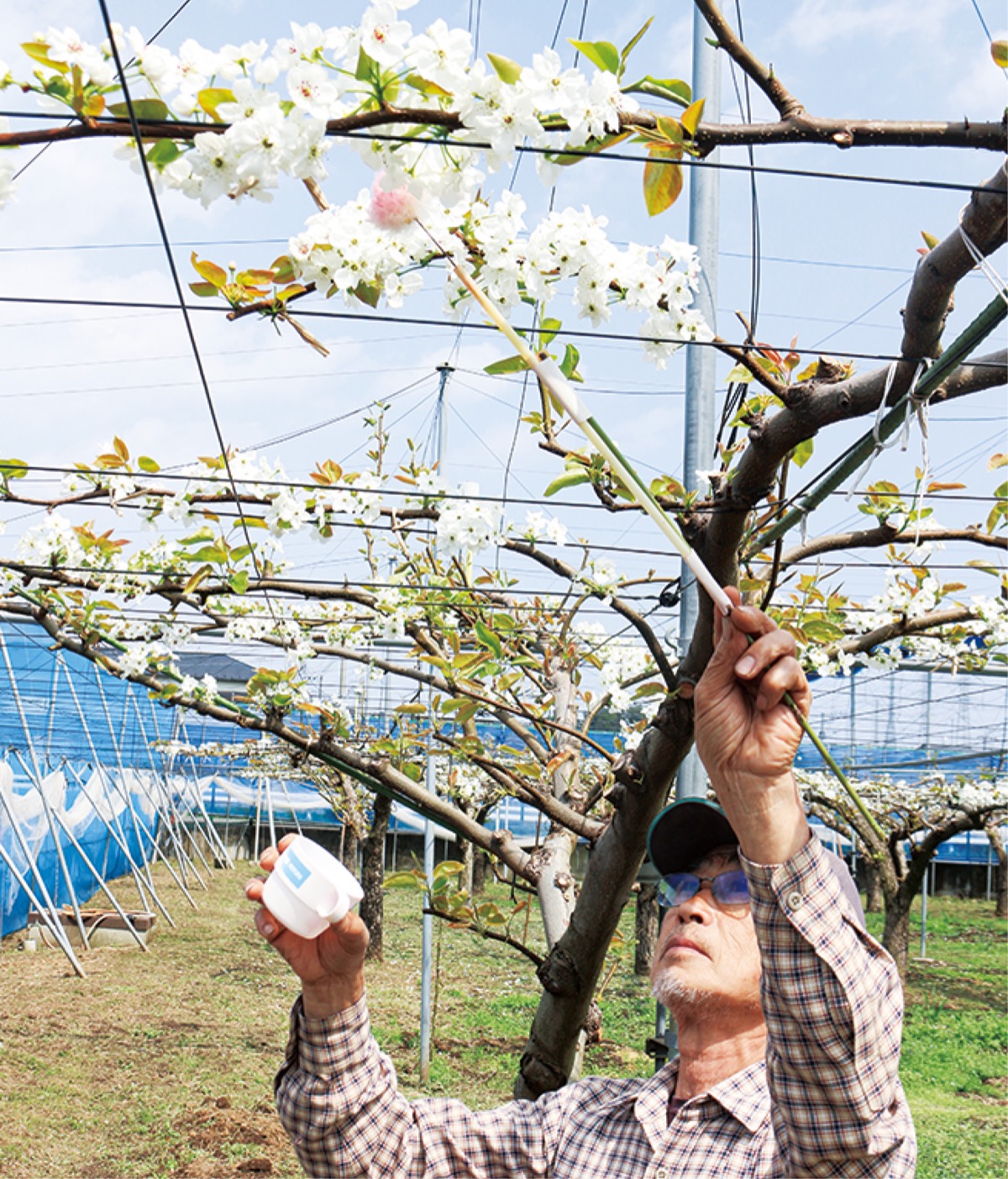 白い花が満開を迎えた梨畑で、横浜市内産のブランド梨「浜なし」の授粉作業が始まった。