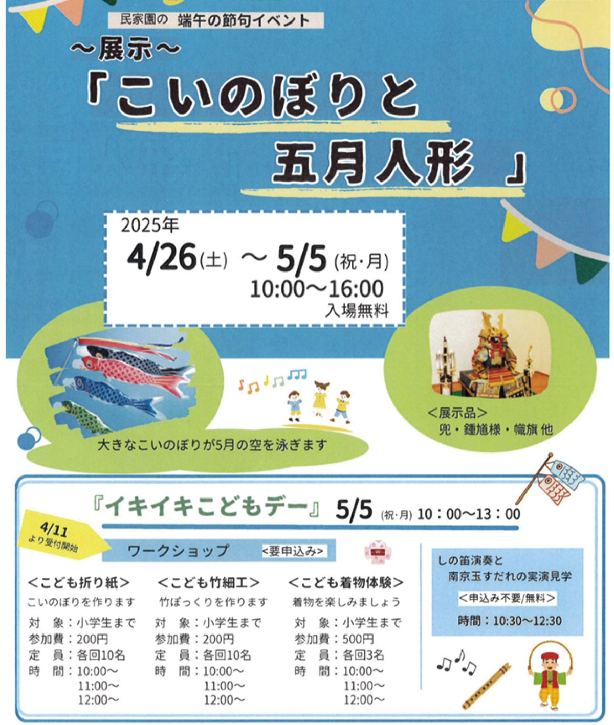 5日には「イキイキこどもデー」を開催。折り紙や竹細工、着物体験のワークショップ(それぞれ午前10時、11時、正午)をはじめ、しの笛演奏と南京玉すだれの実演見学(10時30分から午後0時30分)が楽しめる。