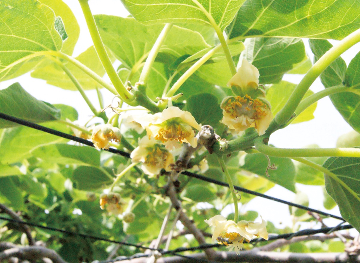 折本町の果樹園、折本園でキウイの花が続々と開花している=4月22日撮影。昨年同様、雨や寒さの影響で例年より1、2週間ほど遅れての開花となった。