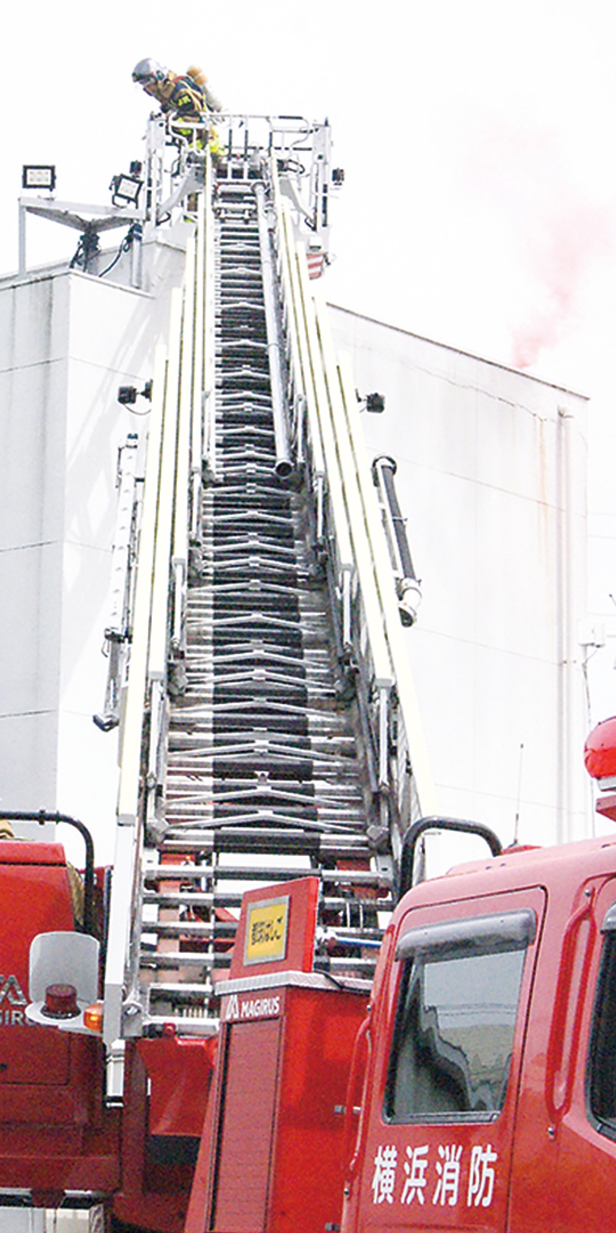 訓練は、都筑消防署協力のもと、2部構成で行われた。1部は、同社2階で火災が起きたことを想定。逃げ遅れて屋上へ避難した従業員を、消防署員がはしご付消防自動車を使い、「救出」した。2部では、地震発生後、同社敷地内で火災が起きたことを想定し、従業員らが通報やけが人の救助、放水による消火などの訓練を実施した。その後、従業員と東方町内会員に向け、消火器やAEDの使用方法のレクチャーも行われた。訓練では緊迫した空気の中、大きな声で連携を図る従業員の姿が多く見られた。