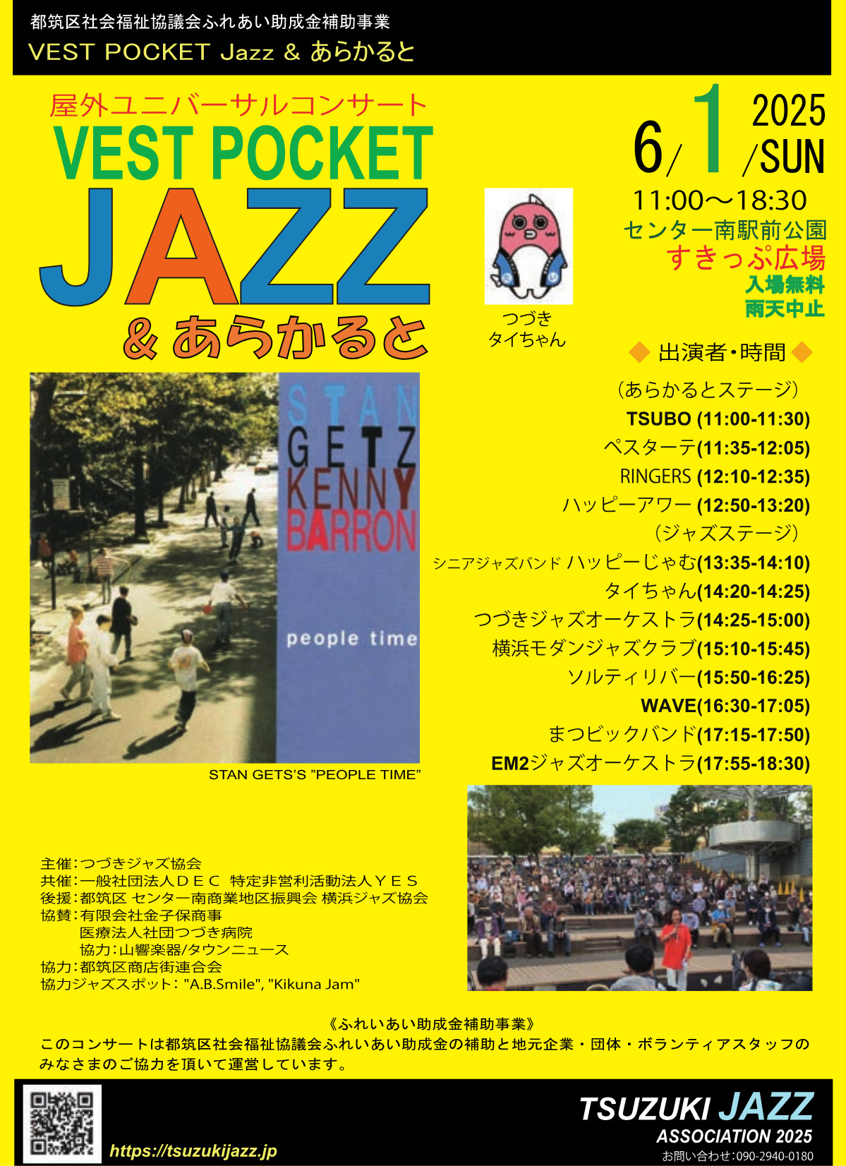 都筑区内で活動するジャズバンドやオーケストラなどを中心に、11組がパフォーマンス。また、都筑区商店街連合会公式キャラクター「つづきたいちゃん」も登場する。