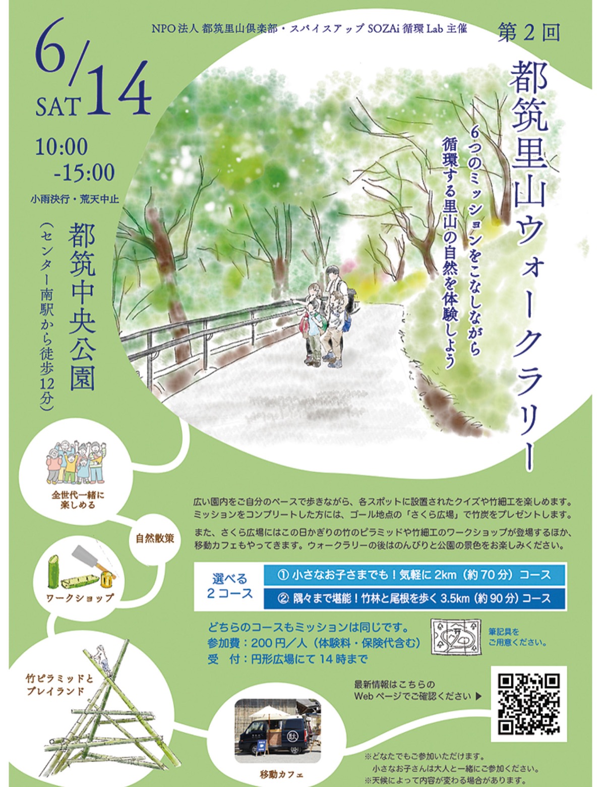 ウォークラリーは、園内に設置されたミッションをこなしながら里山の自然を堪能する企画。コースは子どもでも気軽に参加できる「気軽に2Kmコース(約70分)」と園内を隅々まで堪能できる「竹林と尾根を歩く3・5Kmコース(約90分」の2つ。ミッションをクリアするとゴールのさくら広場で竹炭がプレゼントされる。