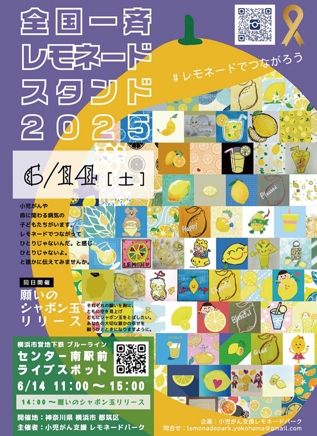 都筑区で活動する「小児がん支援レモネードパーク(荻原沙織代表)」が今年も6月14日(土)、センター南駅前のライブスポットで「全国一斉レモネードスタンド2025」を開催、レモネードなどの販売を行う。午前11時から午後3時。