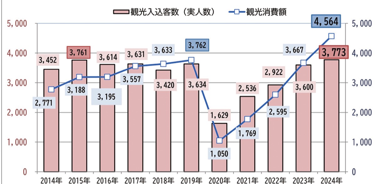 観光消費額の内訳は宿泊が2581億円、日帰りが1983億円。宿泊客の平均消費額は24年に5万553円と、右肩上がりで増加している。