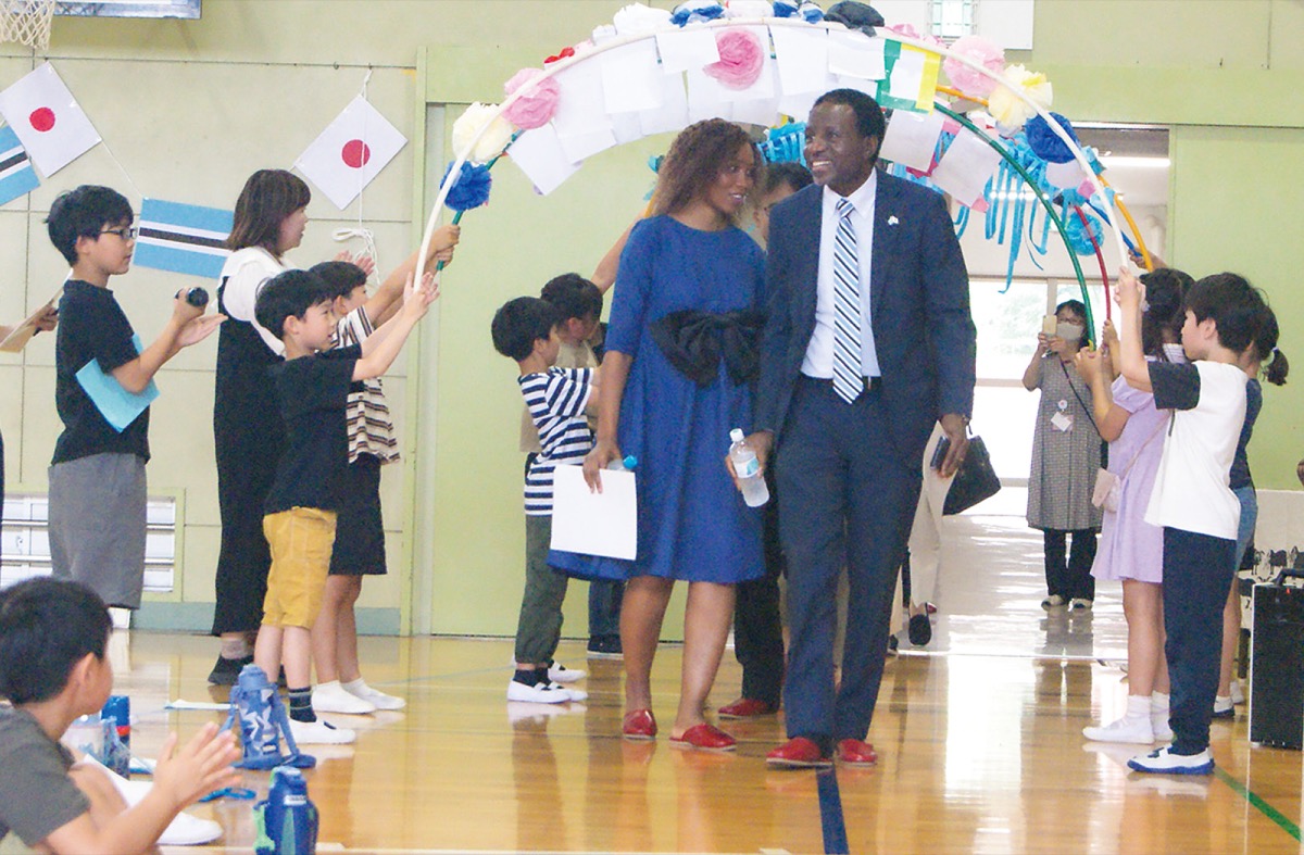 茅ケ崎小学校(高橋美都子校長)に6月20日、ボツワナ共和国の臨時代理大使、ダニエル・カサ参事官らが来校。国際理解教室が行われた。
