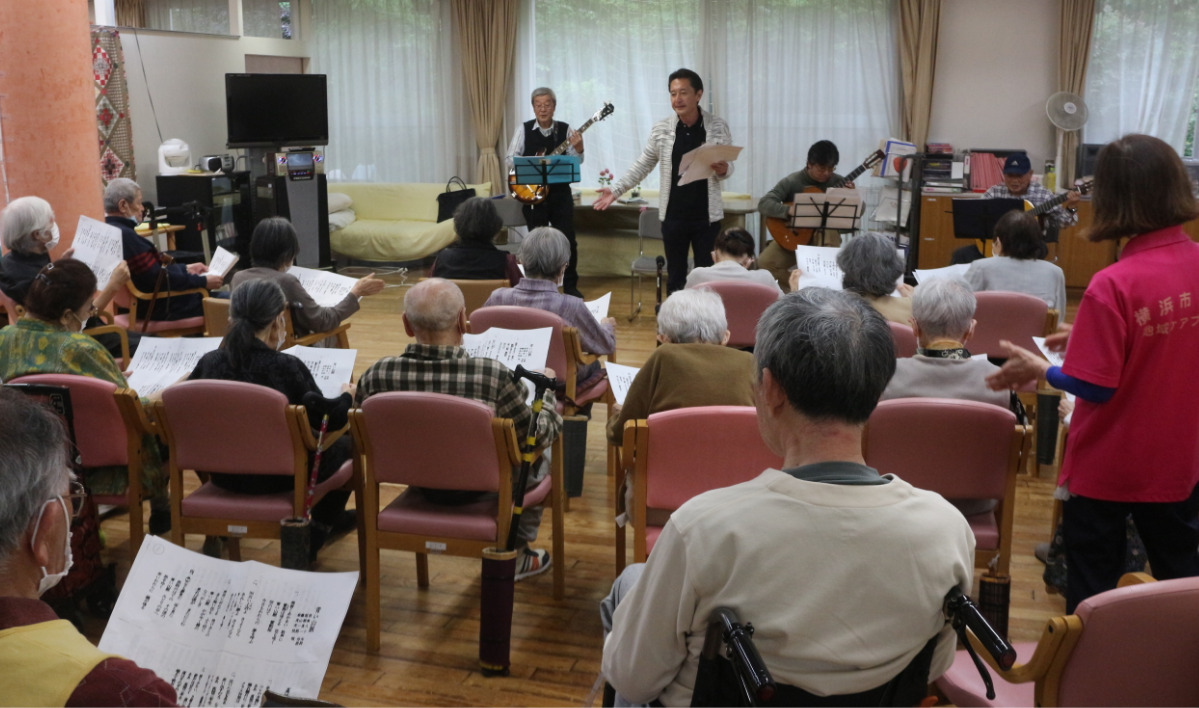 メンバーはデイサービス利用者らと「青い山脈」や「ブルーライトヨコハマ」、「君といつまでも」など全8曲を一緒に歌ったほか、ギターやオカリナの演奏を披露した。