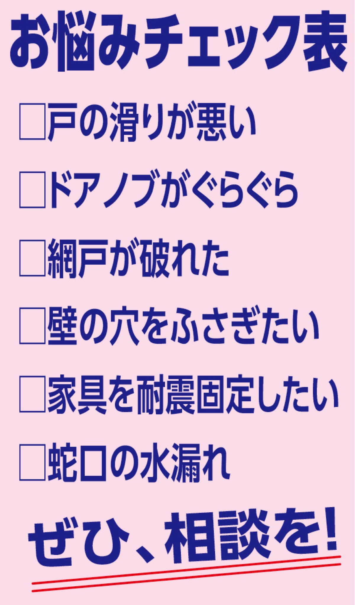 基本は点検・修理を対応し、状況に応じて、部品交換・工事の内容を説明する。地域で住まいの悩みを持つ人が気軽に依頼できるように、と出張費・見積り費用は無料で対応してくれる。