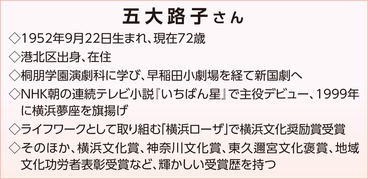 港北区在住の女優・五大路子さん(72)は、「横浜夢座」の座長として、横浜を題材にした作品を演じている。同劇団を旗揚げして26年。五大さんに、情熱をもって発信し続けられる秘訣を聞いた。