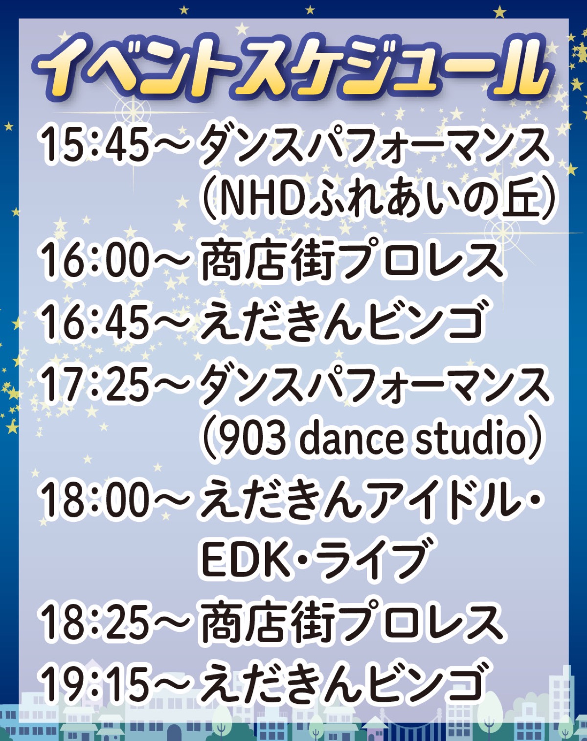 模擬店や豪華景品が当たるビンゴ大会を楽しめるほか、大日本プロレスによる「商店街プロレス」やえだきんアイドル「EDK」のライブパフォーマンス、一時保育・さんぽによる人形劇「手裏剣しゅしゅしゅ」などがイベントを盛り上げる。