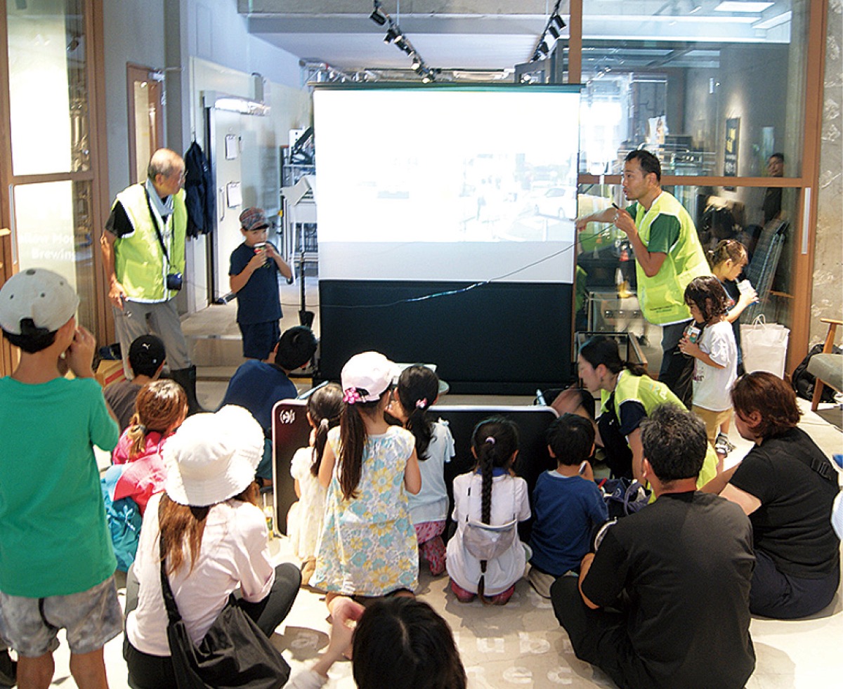 作戦終了後、参加者らはYMBに移り、ジュースやビールで「ひと休み」。ぐるっと緑道による、クイズを交えた緑道の紹介なども行わた。
