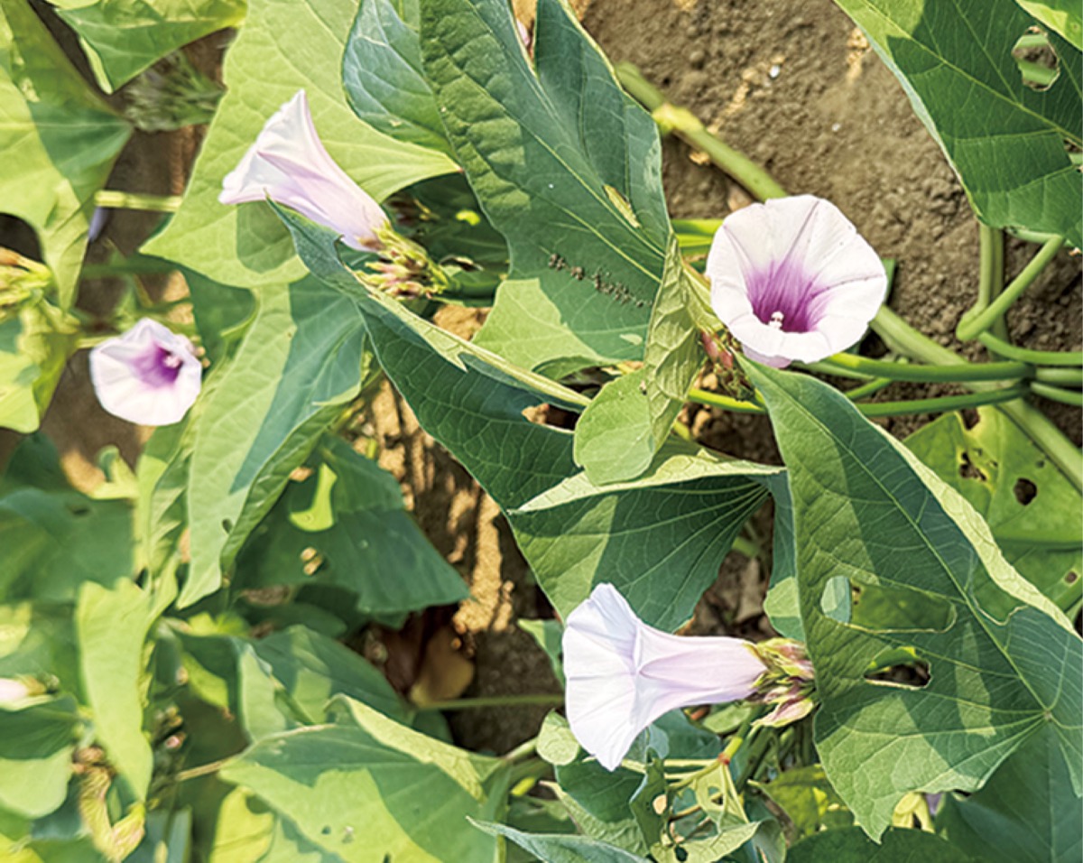 茅ケ崎南第一自治会(新井重太会長)の備蓄庫で栽培しているさつまいもの花が開花した=写真。