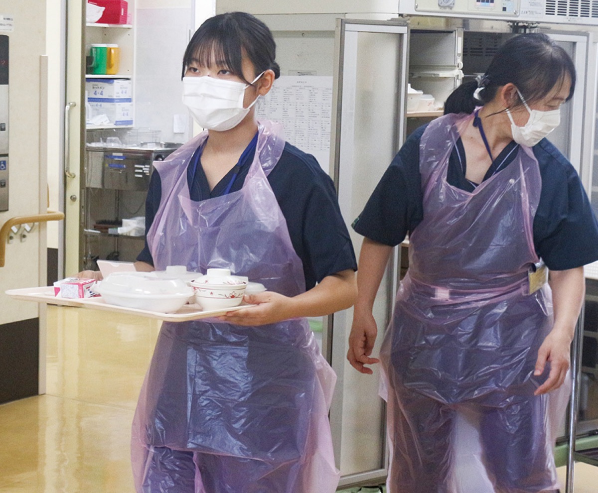 8月5日の体験会には高校生3人が参加。3人は紺色のナース服に着替え、高橋久美看護部長の案内で院内を見学した後、それぞれ看護師に付き、体温や血圧の測定、聴診、体位交換、昼食の配膳などを行った。