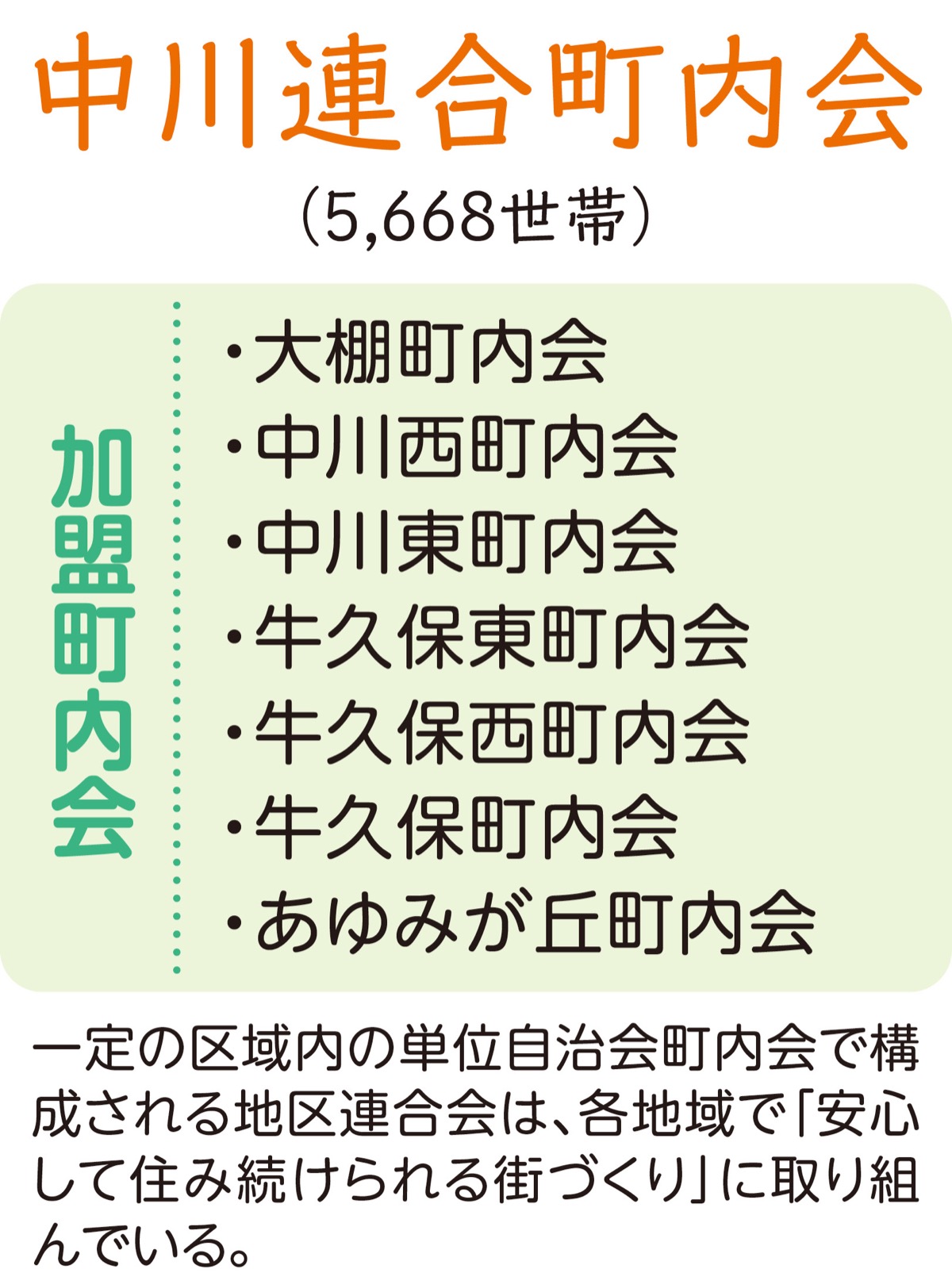前会長から指名を受け、今年会長に。「総務をやっていたので、他の連合町内会自治会の会長とも顔見知り。地域のこともよく知っているので、不安はない」と晴れやかな表情を見せる。「エリアが広い中川連合町内会は7つの町内会で構成され、意欲的な会員も多く、助かっている。世代交代しても、変わらず和やかな町内会であるように自身の役割を果たしたい」と強みを語る。