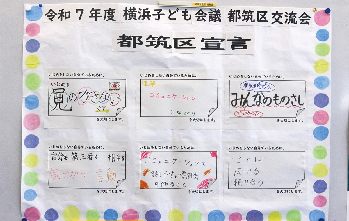 いじめの未然防止を目的に、全市立学校の児童生徒が主体的に考え、話し合う「横浜子ども会議」の区交流会が8月末、各区で開かれた。都筑区では児童生徒の代表が集まり、「都筑区宣言」を決定した。