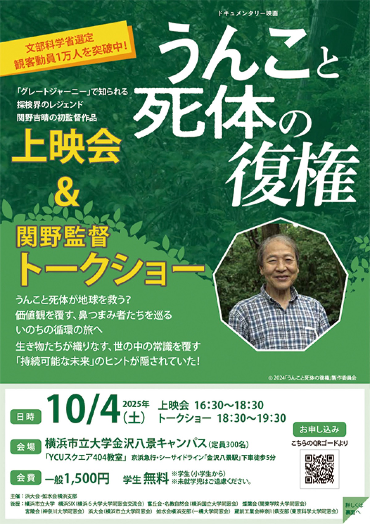 探検家の関野吉晴さん(横浜市立大学医学部・一橋大学法学部卒業)が初監督を務めたドキュメンタリー映画『うんこと死体の復権』が10月4日(土)、金沢区の横浜市立大学金沢八景キャンパスYCUスクエア404教室で開催される。上映会は午後4時30分から6時30分。関野さんのトークショーは6時30分から7時30分。