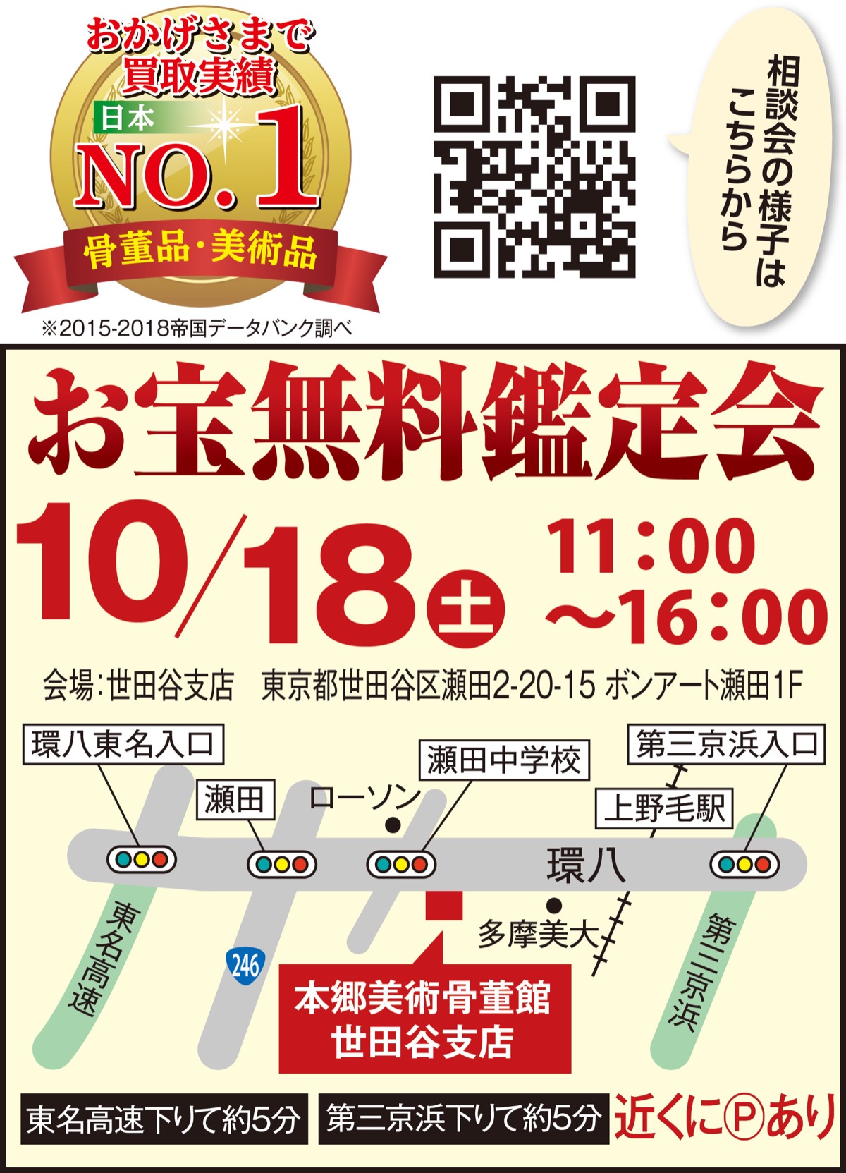 本郷美術骨董館・世田谷支店では10月18日(土)、「お宝無料鑑定会」を開催する。同店は東大赤門前で創業40年になる美術品や骨董品の専門店。経験豊富な各分野の鑑定士が27人も在籍し、様々な提案を行ってくれる。現代アート、絵画、茶道具、古美術品等あらゆるジャンルに対応できるのも魅力。TVや新聞、雑誌にも数多くとりあげられているので安心だ。特に中国美術の買取りを強化している。まずは気軽に相談を。