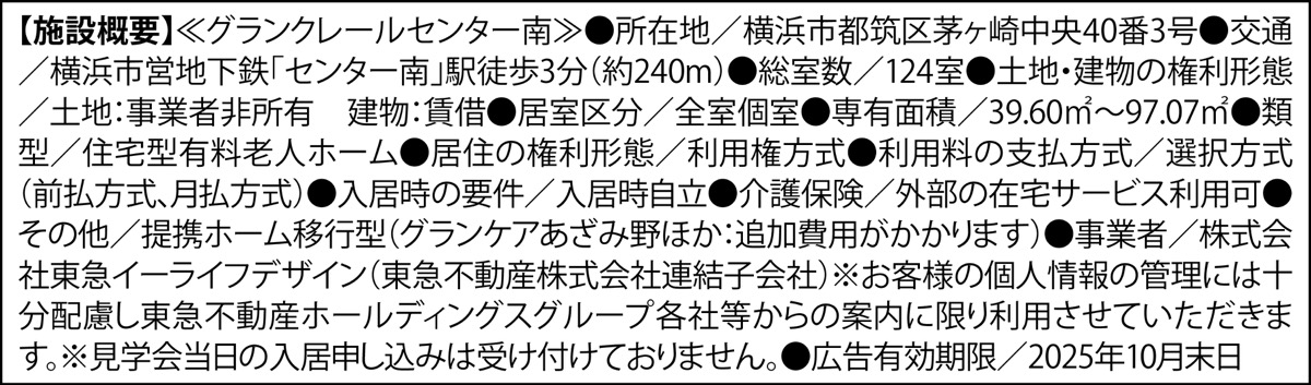 東急不動産HDグループ運営のシニア住宅「グランクレールセンター南」は、港北ニュータウンの中心に位置し、その利便性の高さで人気を博している。現在、夫婦向けの2LDK居室が残りわずかとなっている。