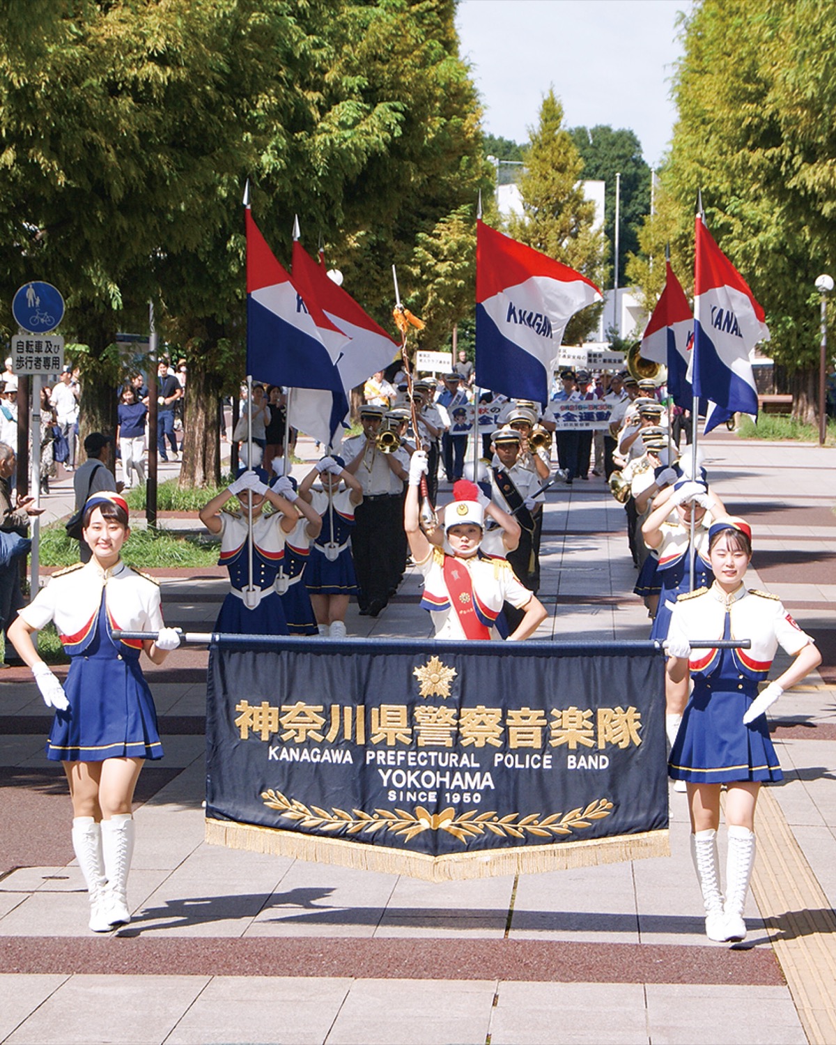 大谷「署長」は、県警音楽隊先導のもと、警察署員や関係団体ら約100人と、警察署からセンター南駅までパレードを行った=写真。パレード後には、駅前のすきっぷ広場で同隊の演奏と演技が披露されたほか、駅周辺では啓発チラシや反射材などが配られた。