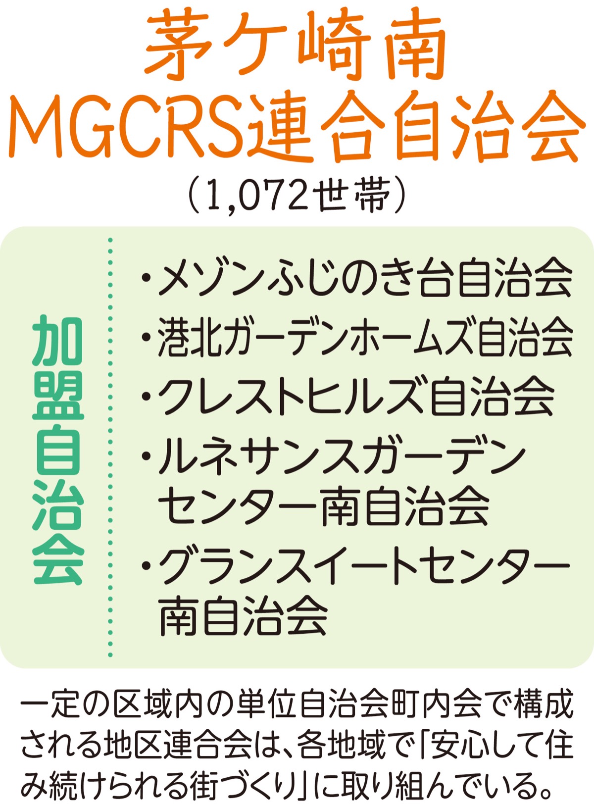 同会は、今年から秋開催に変更した「秋まつり」をはじめ、体験訓練や講習を交えた「防災訓練」、防犯パトロール、地域の清掃活動などに力を入れている。また活動内容を年3回の「MGCRS通信」、年2回の「地域活動だより」で紹介している。