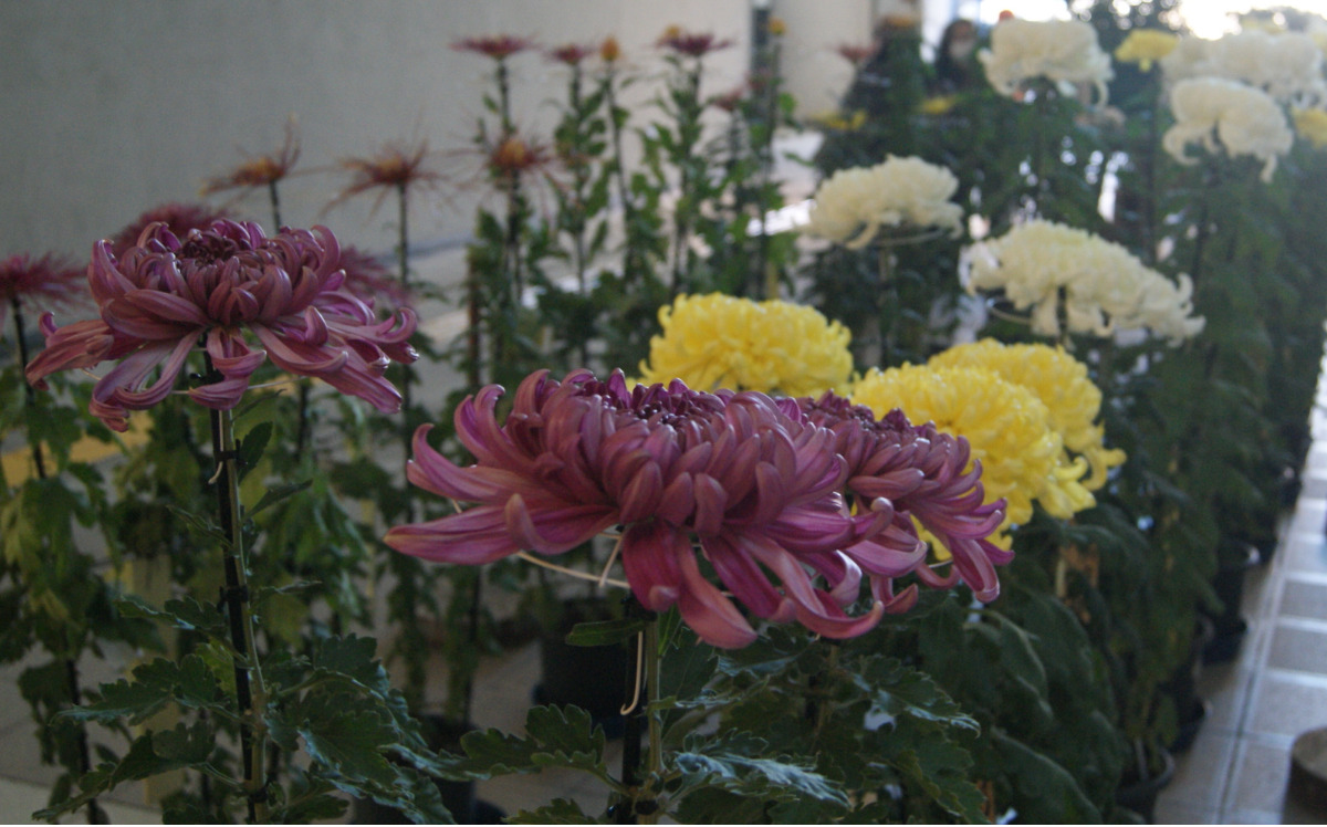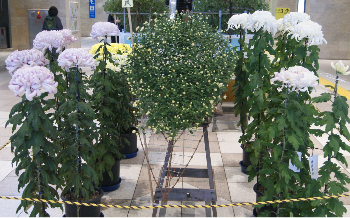 横浜北部菊花会(田丸秀昭会長)が主催する「都筑菊花展」が11月10日まで、センター南駅1階構内で開催中。
