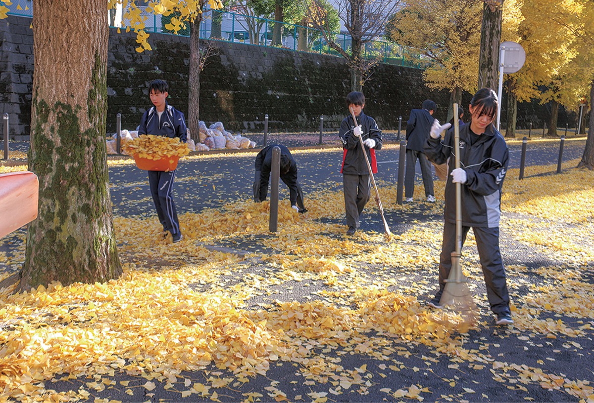 そこで昨年度から地域貢献活動に積極的に取り組んでいる同校の生活福祉委員会が、ボランティアとして落ち葉集めを手伝っている。