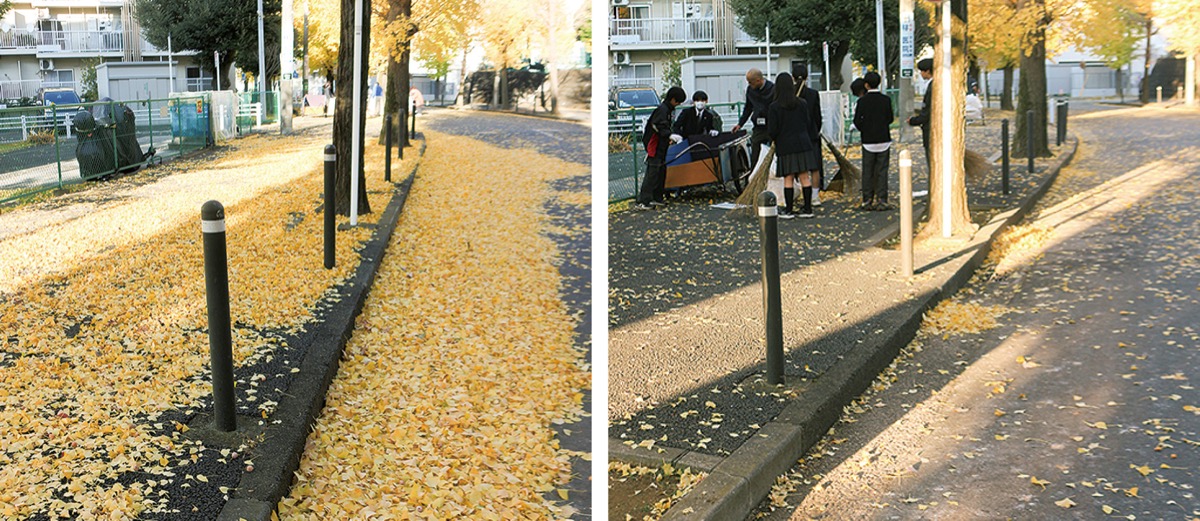 勝田団地は120本以上のイチョウが並木通りを作る区内でも有名なイチョウの名所。しかし、毎年地域住民を悩ませているのが落ち葉の清掃で、同連合の中山敏明会長は「自治会員は高齢者も多く、週2回の落ち葉の清掃活動は重労働」と困り果てていた。