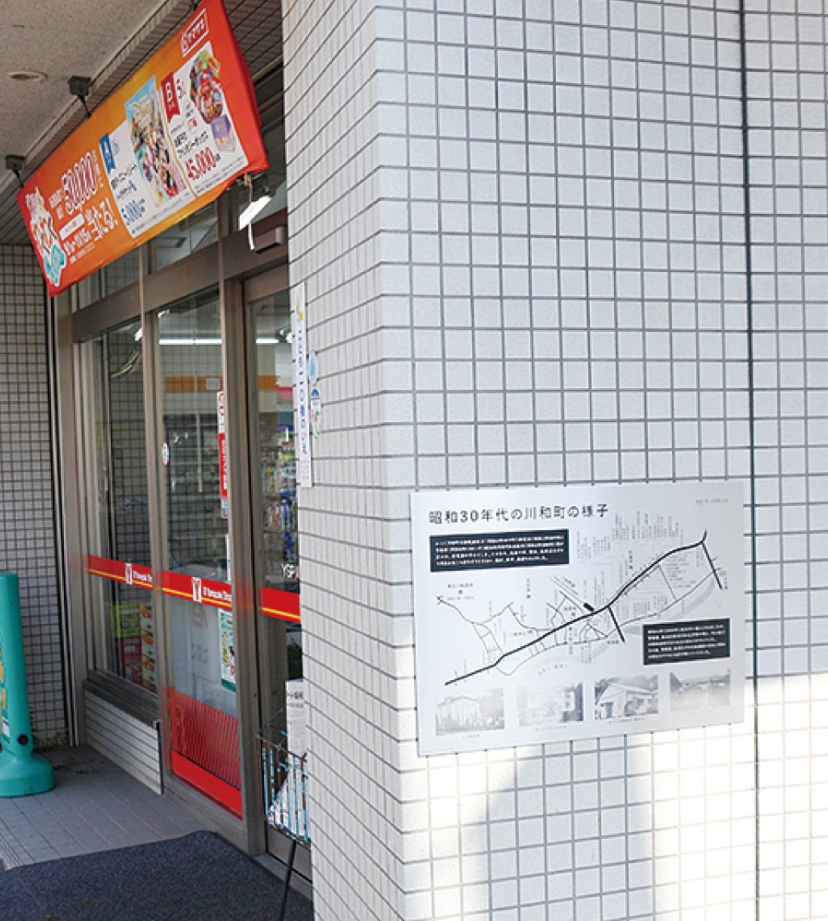 制作された地図は「昭和30年代の川和町の様子」=上図=を示すものと「川和宿と八坂神社天王様」=下図=と題した江戸時代の宿場があった頃を記したもの。どちらもアルミ製のプレートで制作され、「昭和30年代〜」の地図は川和町駅近くのヤマザキショップ川和町・なかむらや店の壁面=左写真=に、もう一枚は八坂神社=左下写真=にそれぞれ掲示されている。
