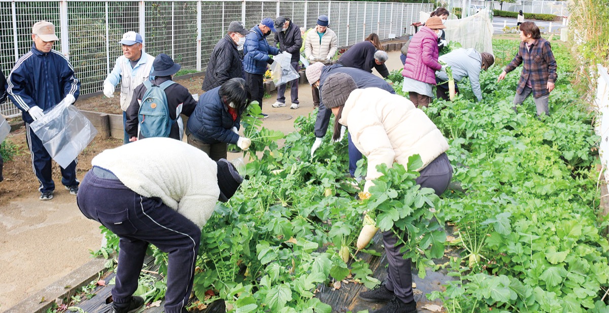 緑産業道路から佐江戸せせらぎ緑道へつながる細い小路の脇に整備した花壇や農地で、野菜や花などを栽培している「活(い)きいきファーム(安部喜平代表)」が12月13日、現地で大根の収穫と茶会を催し、設立15年の節目を祝った。