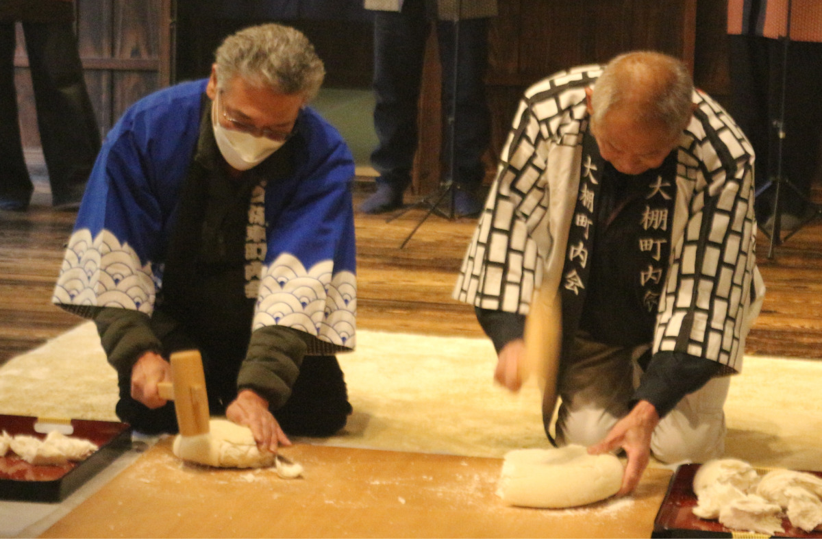 「七草きざみ歌」は、かつて、七草を刻む際にまな板を包丁でリズミカルに叩きながら「ナナクサ・ナズナ・トウドノトリガ・ワタラヌウチニ・ストトントン」と唱えた歌。当日は町内会の会員が歌を歌いながら七草を刻んだ。