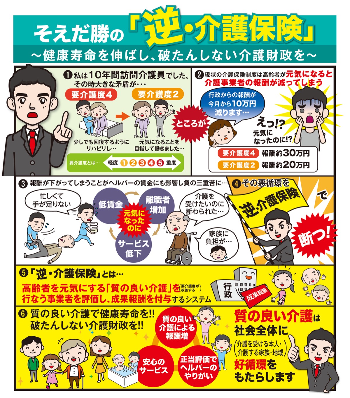 介護度合いの改善を成し遂げた場合に成功報酬を支給する制度を「逆・介護保険」と名付けて、川崎市政に挑戦しました。市議として3期、制度に参加した方々の要介護度改善率日本一を達成。元気な高齢者が増えた結果、医療・介護費の削減にも成功しました。全国へ広げていければ。