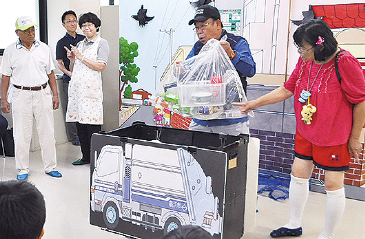 その後、まちの美化に貢献している区環境事業推進委員4人が、区内にある幼保園ユニバーサルキッズの園児13人に対し、ごみ分別の大切さを伝える寸劇を披露=写真。行政官は劇でのPRを興味深そうに見学していた。