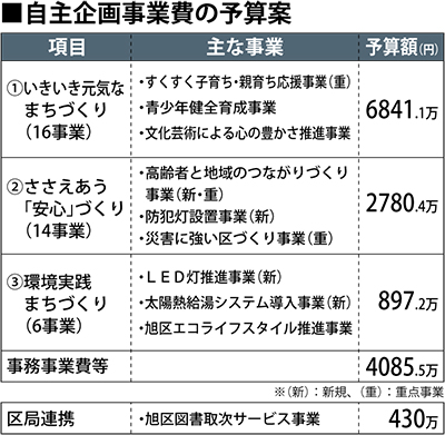 旭区が来年度に推進する自主企画事業では、【1】いきいき元気なまちづくり【2】ささえあう「安心」づくり【3】環境実践まちづくり―の3項目を柱に掲げている。