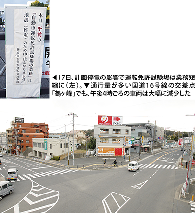 区内外から多くの利用者が訪れる中尾の自動車運転免許試験場では14日から、計画停電に応じて原則午前もしくは午後のみの業務体制に。二俣川と横浜、湘南台、海老名の相鉄線各駅で職員が案内している。県警ホームページでも確認可。
