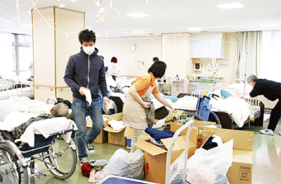 定員130床に228人―。3月19日、被災した福島県南相馬市の高齢者施設利用者を独自に受け入れた、区内の介護老人保健施設「老健リハビリよこはま」(都直人理事長=金が谷)。同施設内では、職員やボランティアが数日間にわたり奮闘した。
