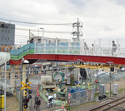 昨年6月から全面付け替え工事が進められている三ツ境歩道橋。三ツ境駅西口から連絡する同歩道橋では、バリアフリー化を目指して急勾配と段差の解消や、点字ブロックの敷設、エレベーターの設置工事などが行われている。