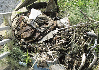 同会では月3回ほど、帷子川の区役所付近から御殿橋まで約1・5Kmにわたり清掃活動を続けている。メンバーが活動範囲外の水道橋付近でアユの群れを発見したことから、8月中旬に同所周辺の清掃活動を行った。下水処理が進んだこともあり、水質は改善されているが、依然なくならないのがごみの投棄問題だ。同会メンバー7人が3時間かけて回収したごみは2トン車1台分。川からは自転車や家庭用ゲーム機、テレビ、パソコン、テーブル、鉄パイプなど目を疑うようなごみが次々と出てきた。