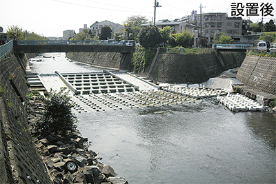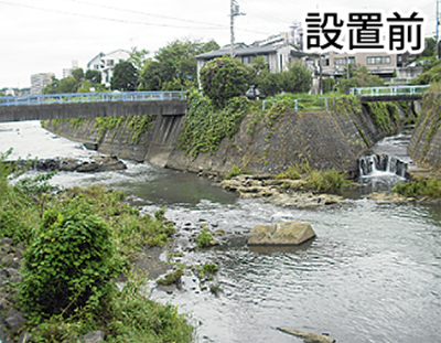 新設された魚道は、昨年設置された用賀下橋下流と同じ「円柱式粗石魚道」。中堀川との合流点には約3mの落差があった。そのため、昨年まではほとんどアユを確認できなかったという。同時期に、神奈川県が管轄する西谷にある放水路に魚道が設置されたこともあり、8月19日現在、鶴ヶ峰バスターミナル下の水道橋周辺まで、川を飛び跳ねるアユの姿が橋の上から確認されている。