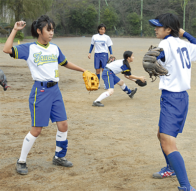 先輩が華麗なグラブさばきや強肩を次々に披露すると、生徒たちからは「すごい」「速い」と感嘆の声も。「自分たちの練習を見てもらって、少しでも刺激になれば」と喜多真弓監督。主将の2年、工藤アンリさん(14)は「声の出し方から動きまで、キレが全然違った。今日の練習を糧に、(主将として)率先して行動していきたい」と決意を語った。