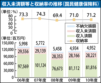 2010年度までの国民健康保険料の収入未済額は、282億2055万円(前年度比5486万円増)で、そのうち徴収できなくなった不納欠損額は49億5203万円(前年度比1844万円増)に上る。未済額は、2番目に多い市税(市民税・固定資産税等)が約148億円と、倍近くとなっている。一方で収納率は、財産差し押さえなどの滞納処分が増えたことで、前年度比0・2ポイント増の71・2%と微増した。約3割が未納だが、これには不納欠損分も含まれる。
