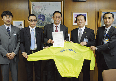 地域のボランティア団体らが行政と協力し、道路の清掃、美化活動を行う横浜市の事業「ハマロード・サポーター」。旭区で14番目となる認定団体に、道路建設業「大成ロテック株式会社関東支社横浜事業所」(常木長泰所長=写真中央・上川井町)が加わった。11月8日には、旭区役所区長室で認定式が行われ、旭土木事務所(片桐晃所長)との間に覚書が結ばれた。区内の企業の登録は横浜農業共同組合に続く2団体目。