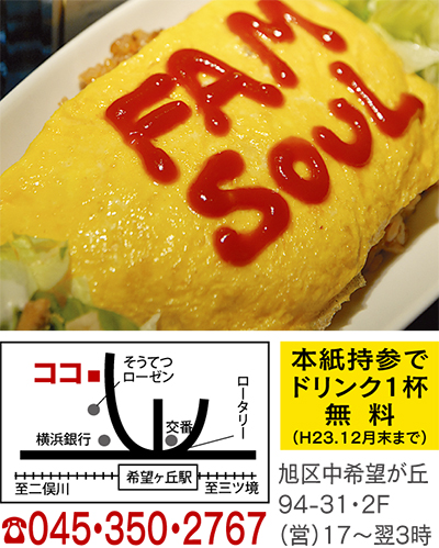 希望が丘で開店4年目の、知る人ぞ知るバースタイル居酒屋「ファム」。北海道出身の店長が腕をふるう郷土料理と、創作オムライス「ファムライス」=写真=が人気の理由だ。