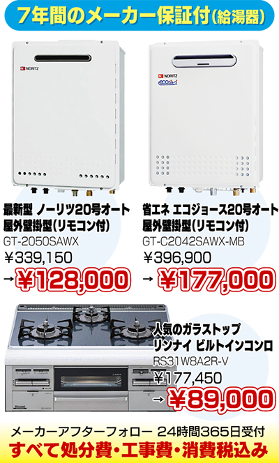 ガス給湯器・ビルトインコンロが大特価