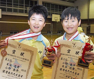 12月23日から27日に北海道釧路市で行われた第20回全国小学生バドミントン選手権大会で、小野泰平君(9)=東希望が丘小3年=と末永逸貴君(9)=善部小3年=が男子ダブルス4年生以下に初出場。同部門唯一の3年ペアながら、3位入賞を果たした。