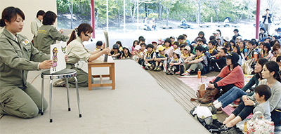 24日の寄贈式には、同園の指定管理者、(公財)横浜市緑の協会・吉田哲夫理事長ら関係者が出席。園内「みんなのはらっぱ」大テントには、伊勢原市立成瀬小学校の児童約110人のほか、多くの入園者が集まった。柳生氏は「地面に取り残された野鳥のヒナを、『かわいそうだから』と拾わないで」と語りかけた。