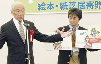 4月24日で開園13周年を迎えたよこはま動物園ズーラシア=上白根町=に、(公財)日本野鳥の会・柳生博会長が来園。「ヒナを拾わないでキャンペーン」の一環で同会が制作した絵本「ぼくとりなんだ」と紙芝居「わたしのことり」を、同園に寄贈した。