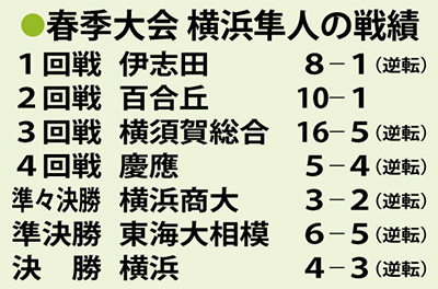 今回の春季大会も逆転に次ぐ逆転で、7試合中6試合が逆転勝ちだ(=表参照)。4回戦では延長13回の死闘を制し、慶應にサヨナラ勝ち。ここで勢いに乗ると、準々決勝で横浜商大、準決勝で東海大相模と強豪校を逆転で下し、決勝では4期連続の甲子園出場を目指す横浜を、またも逆転で退けるという強さを見せた。「どこもうちの勢いを止められなかった」と指揮官は冷静に分析する。