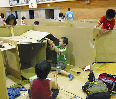昨年発足した同会が企画したもので、自由公募で1〜6年の児童58人が参加。講師に防災士の杉野行雄さん(63)と大高(おおたか)拓さん(42)を招き、ダンボールによる簡易版の仮住まいを作製した。葛飾区でゴム製品会社を営む杉野さんと同区議会議員の大高さんは、阪神・淡路大震災以降、国内被災地の支援活動を続けている。
