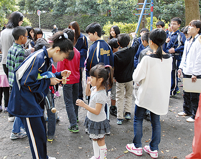 地域参画型の小中一貫教育カリキュラムの一つとして、市立若葉台小学校(竹内詩朗校長・443人)と若葉台中学校(鈴木洋一校長・284人)による交流イベントが10月30日、地区内6カ所の公園で行われた。「昔遊びオリエンテーリング」と題し、自治会や老人会、青少年指導員ら約150人の協力のもと、こま回しやけん玉などで得点を競うゲームを各公園で企画。両校の全校児童、生徒が13人程度のグループごとに、東西に分かれて3カ所の公園を回った。